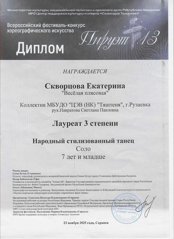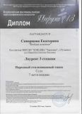 Диплом лауреата 3 степени Всероссийского фестиваля-конкурса хореографического искусства "Пируэт 13" награждена Скворцова Екатерина (педагог Навратова С.П.)