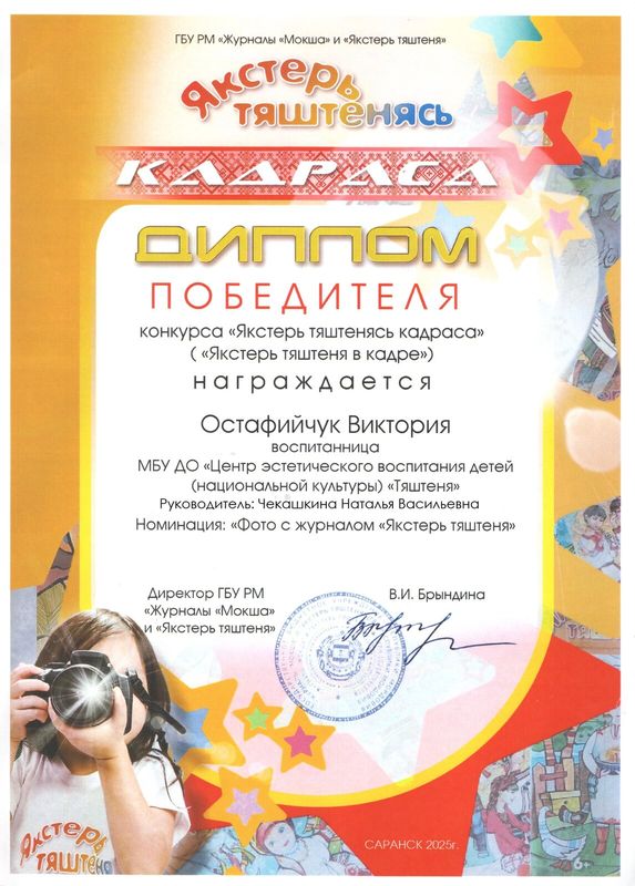 Дипломом победителя Республиканского конкурса «Якстерь тяштенясь кадраса» награждена Остафийчук Виктория (педагог Чекашкина Н.В.)