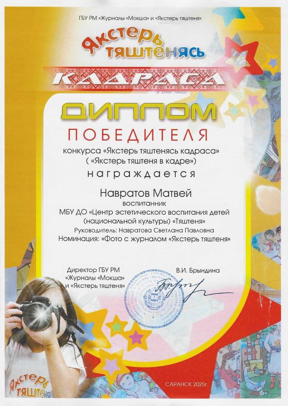 Дипломом победителя Республиканского конкурса «Якстерь тяштенясь кадраса» награжден Навратов Матвей (педагог Навратова С.П.)
