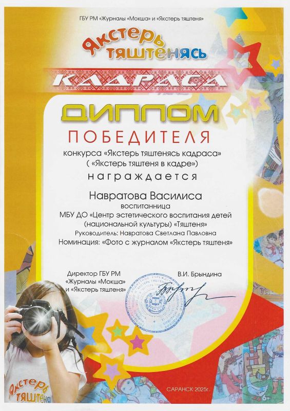 Дипломом победителя Республиканского конкурса «Якстерь тяштенясь кадраса» награждена Навратова Василиса (педагог Навратова С.П.)