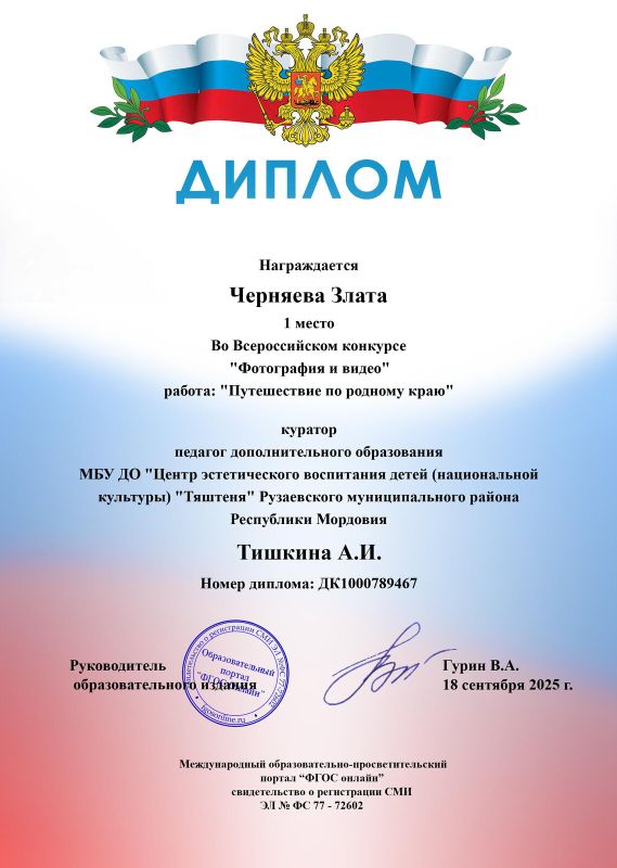Дипломом за 1 место Всероссийского конкурса «Фотография и видео» награждена Черняева Злата (педагог Тишкина А.И.)