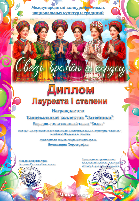 Лауреатом 1 степени Международного конкурс-фестиваля национальных культур и традиций награжден танцевальный коллектив "Затейники" (педагог Надина М.В.)