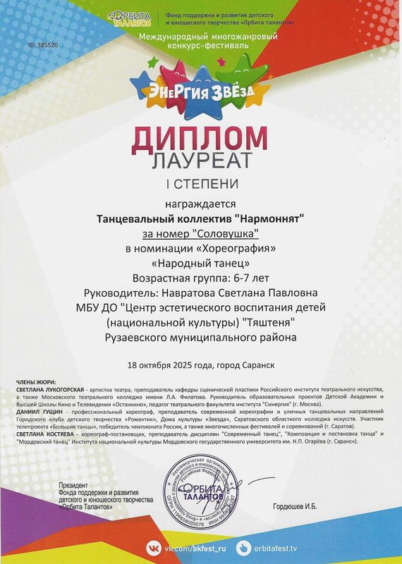 Лауреатом 1 степени Международного многожанрового конкурса-фестиваля "Энергия звёзд" награжден танцевальный коллектив "Нармоннят" (педагог Навратова С.П.)