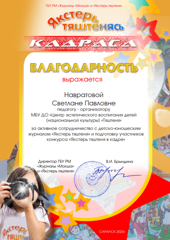 Благодарностью Республиканского конкурса «Якстерь тяштенясь кадраса» награждена Навратова С.П.