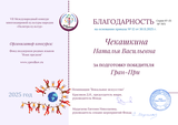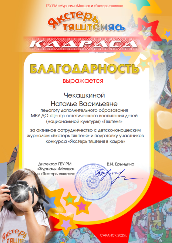 Благодарностью Республиканского конкурса «Якстерь тяштенясь кадраса» награждена Чекашкина Н.В.