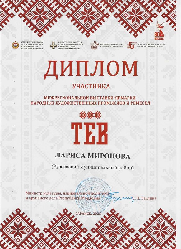 Дипломом участника Межрегиональной выставки-ярмарки народных художественных промыслов и ремесел «ТЕВ» награждена Миронова Л.И.