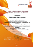 Благодарностью за участие в работе мероприятия посвященное запуску проекта Алгоритмики «Непрерывная система развития ИТ и ИИ навыков для учащихся образовательных организаций Республики Мордовия» награждена Ломова Е.В.