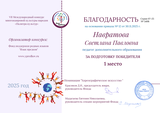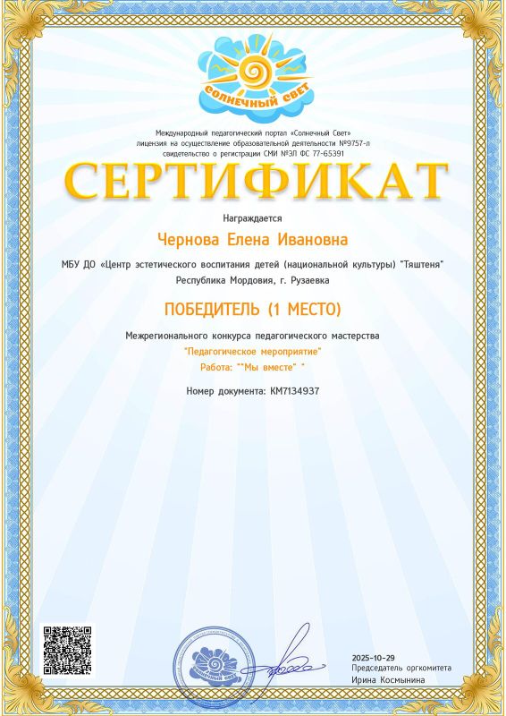 Сертификатом за 1 место Межрегионального конкурса педагогического мастерства «Педагогическое мероприятие» награждена Чернова Е.И.