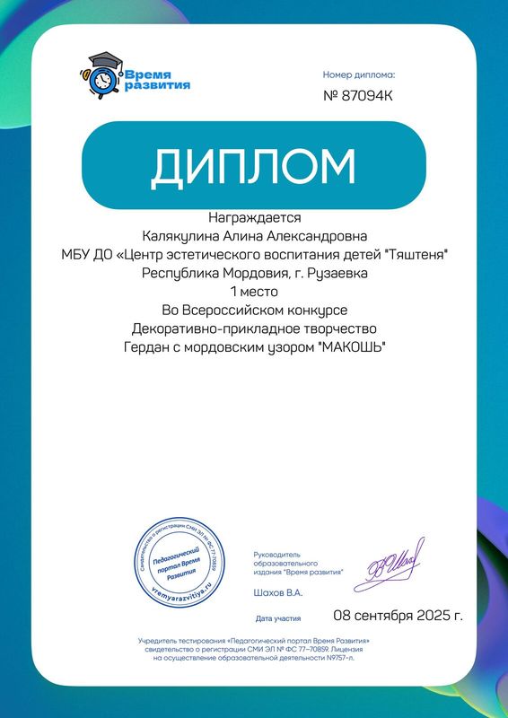 Дипломом лауреата Республиканского фестиваля-конкурса народного творчества «Шумбрат, Мордовия!» награждена Калякулина А.А.