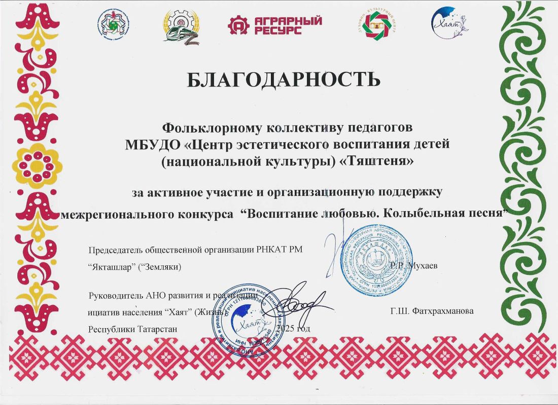 Благодарностью Межрегионального конкурса «Воспитание любовью. Колыбельная песня» награжден фольклорный коллектив педагогов Центра Тяштеня
