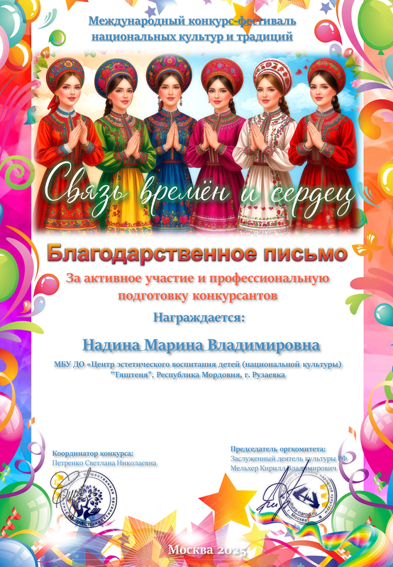 Благодарственным письмом Международного конкурс-фестиваля национальных культур и традиций награждена Надина М.В.