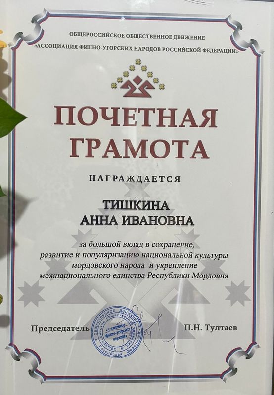 Почетная грамота Общероссийского общественного движения «Ассоциации финно-угорских народов Российской Федерации» награждена Тишкина А.И.