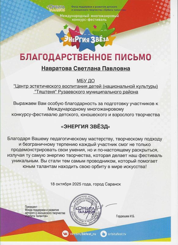 Благодарственным письмом Международного многожанрового конкурса-фестиваля "ЭНЕРГИЯ ЗВЁЗД" награждена Навратова С.П.