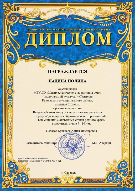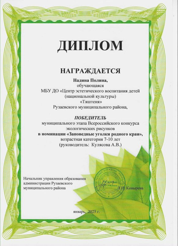 Дипломом за III место Всероссийского конкурса экологических рисунков среди обучающихся образовательных организаций стала Надина Полина (руководитель Кулясова А.В.)