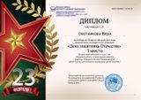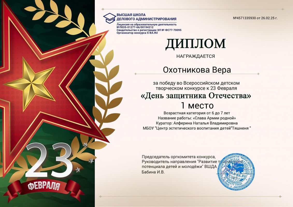 Дипломом за I место Всероссийского детского творческого конкурса к 23 февраля «День Защитника Отечества» награждена Охотникова Вера (педагог Алферина Н.В.)