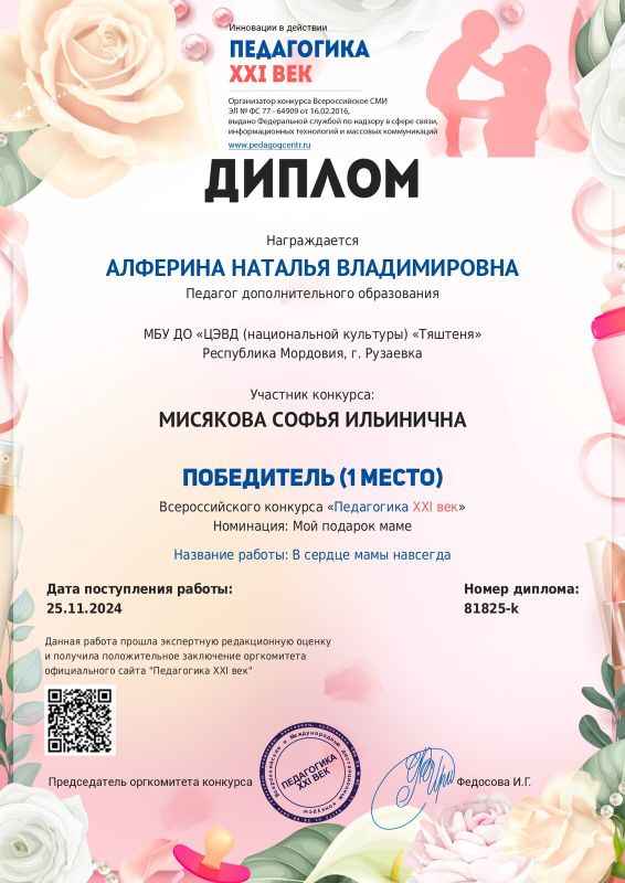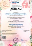 Дипломом за I место Всероссийского конкурса «Педагогика XXI века» награждена Мисякова Софья (педагог Алферина Н.В.)