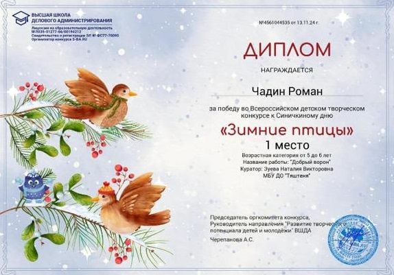 Дипломом за I место Всероссийского детского конкурса к Синичкиному дню «Зимние птицы» награжден Чадин Роман (педагог Зуева Н.В.)