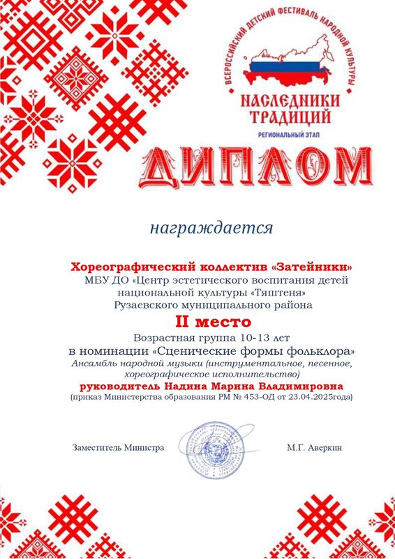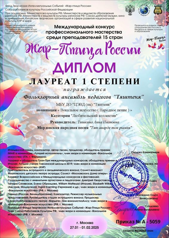 Дипломом I степени Международного конкурса профессионального мастерства среди преподавателей 15 стран «Жар-Птица России» награжден Фольклорный ансамбль педагогов «Тяштеня» (руководитель Тишкина А.И.)