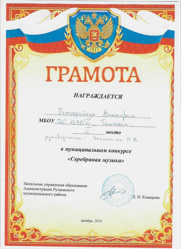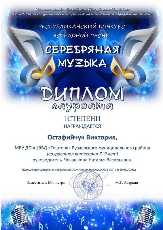 Дипломом за I место XVIII Муниципального этапа республиканского конкурса эстрадной песни «Серебряная музыка» награждена Остафийчук Виктория (педагог Чекашкина Н.В.))