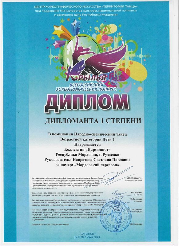 Дипломантом I степени Всероссийского хореографического конкурса "Крылья" стал танцевальный коллектив «Нармоннят» (руководитель Навратова С.П.)