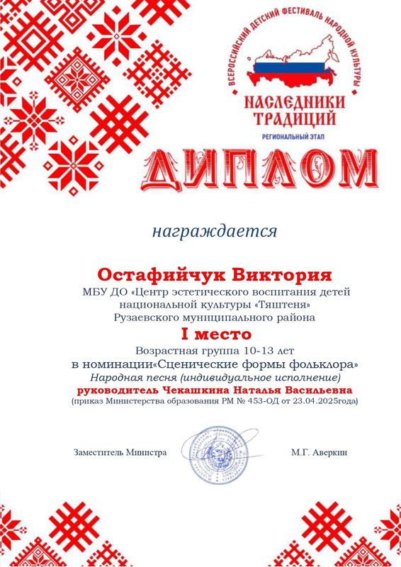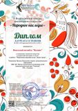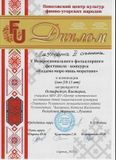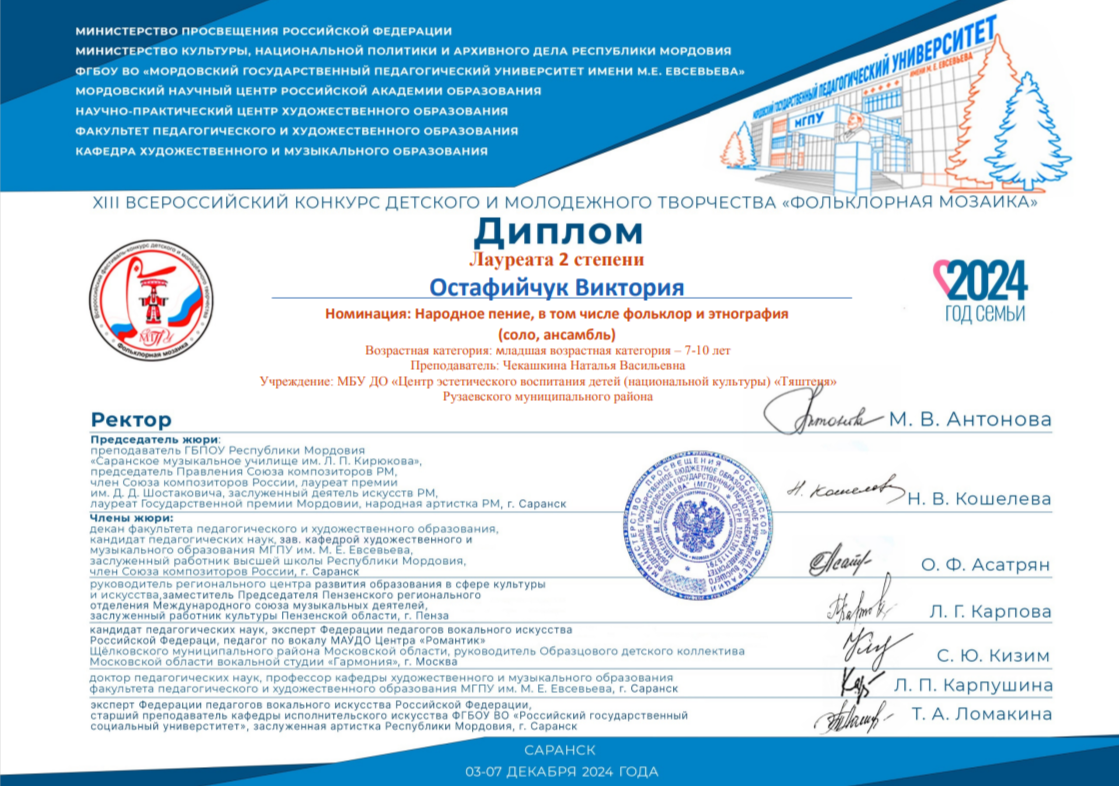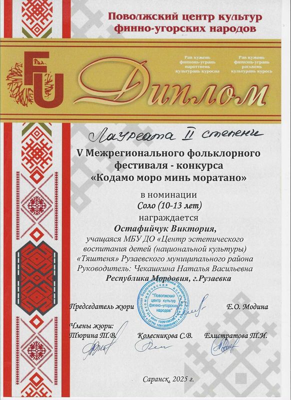 Дипломом лауреата II степени XIII Всероссийского конкурса детского и молодежного творчества «Фольклорная мозаик» награждена Остафийчук Виктория (педагог Чекашкина Н.В.))