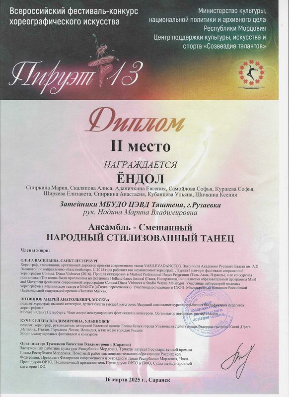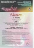 Диплом II степени Всероссийского фестиваль-конкурса хореографического искусства «Пируэт 13» награжден танцевальный коллектив "Затейники" (руководитель Надина М.В.)