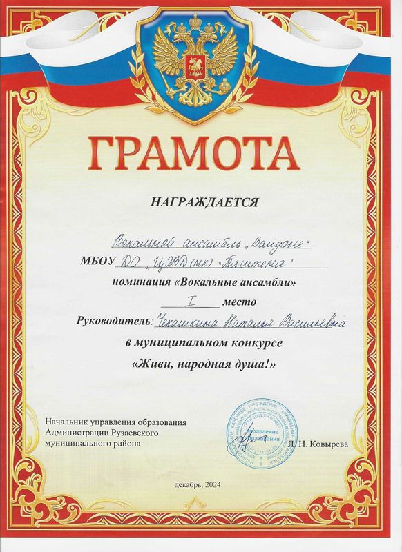 Дипломом за I место Муниципального этапа XIX Республиканского конкурса народной песни «Живи, народная душа!» награжден вокальный ансамбль "Валдоне" (педагог Чекашкина Н.В.)
