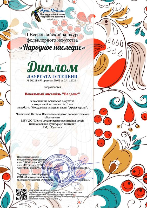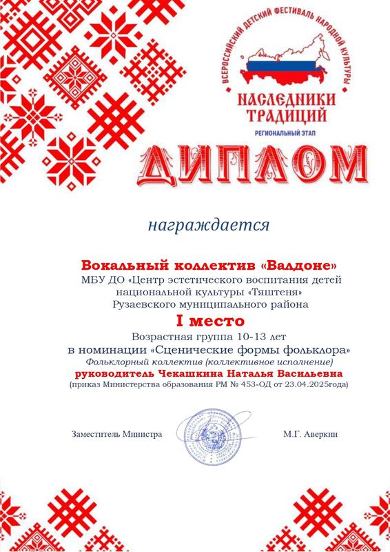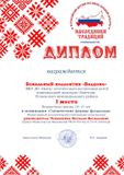 Диплом лауреата I степени II Всероссийского конкурса фольклорного искусства «Народное наследие» награжден вокальный ансамбль "Валдоне" (педагог Чекашкина Н.В.)