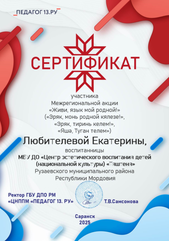 Сертификатом участника Межрегиональной акции "Живи, язык мой родной!" награждена Любителева Екатерина
