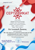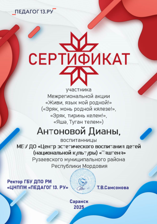 Сертификатом участника Межрегиональной акции "Живи, язык мой родной!" награждена Антонова Диана