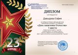 Дипломом за I место Всероссийского детского творческого конкурса к 23 февраля «День Защитника Отечества» награждена Давыдова София (педагог Алферина Н.В.)