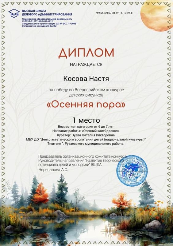 Дипломом за I место Всероссийского конкурса детских рисунков «Осенняя пора» награждена Косова Настя (педагог Зуева Н.В.)