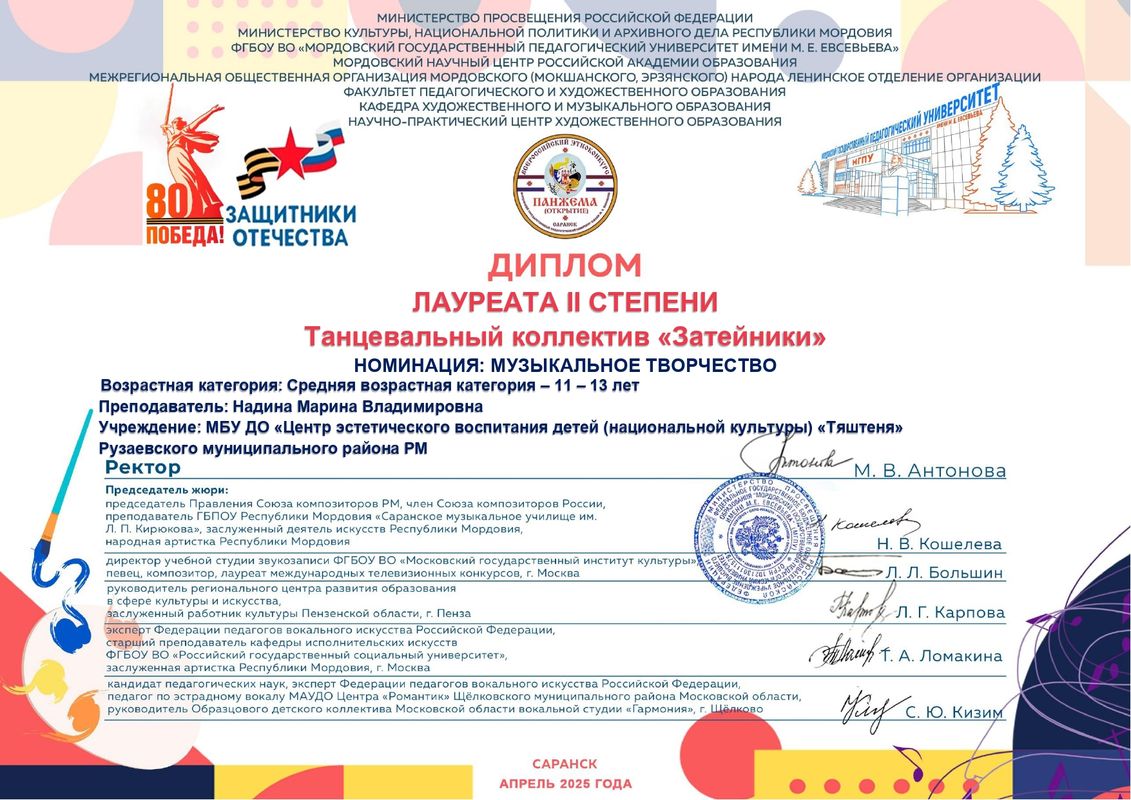 Лауреатом II степени VIII Всероссийского с Международным участием этноконкурса "Панжема" стал танцевальный коллектив «Затейники» (руководитель Надина М.В.)