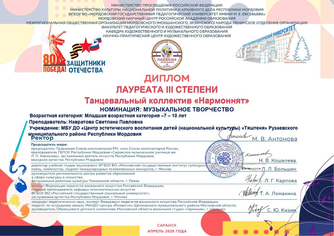Лауреатом III степени VIII Всероссийского с Международным участием этноконкурса "Панжема" стал танцевальный коллектив «Нармоннят» (руководитель Навратова С.П.)