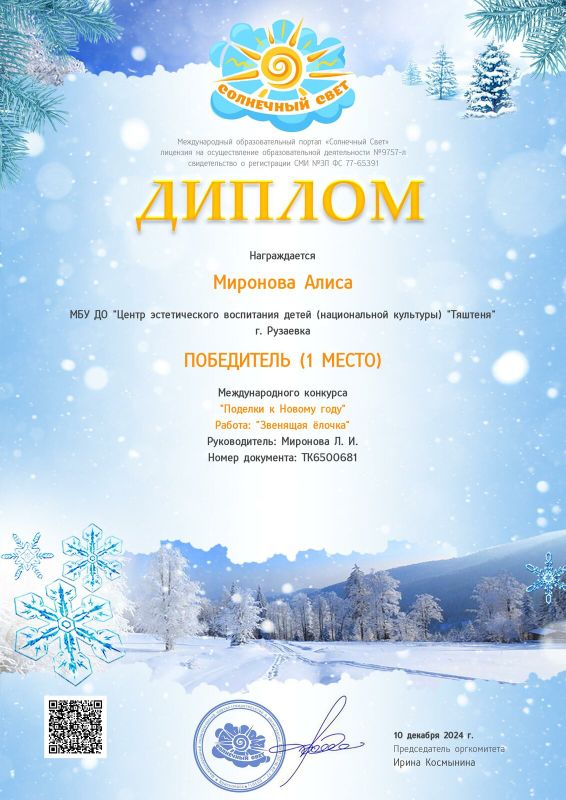 Дипломом за I место Международного конкурса «Поделки к Новому году» награждена Миронова Алиса (педагог Миронова Л.И.)
