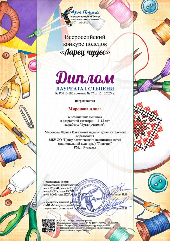 Лауреатом I степени Всероссийского конкурса поделок «Ларец чудес» стала Миронова Алиса (педагог Миронова Л.И.)