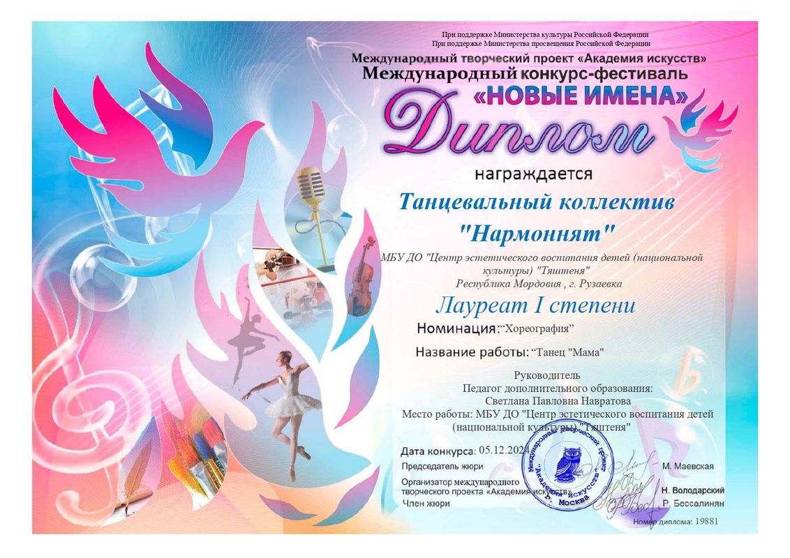 Дипломом лауреата I степени Международного конкурс-фестиваля «Новые имена» награжден коллектив "Нармоннят"" (педагог Навратова С.П.)