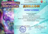 Диплом лауреата III степени Всероссийского конкурса-фестиваля искусств «Серпантин искусств» награжден коллектив "Затейники" (педагог Надина М.В.)