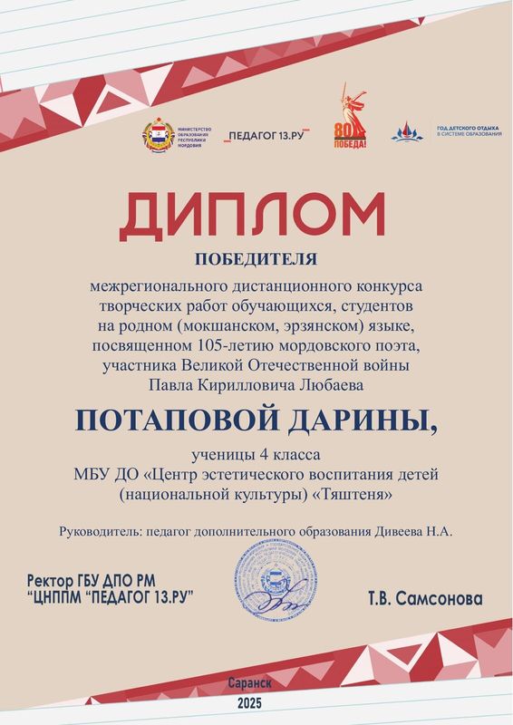 Дипломом победителя Межрегионального дистанционного конкурса творческих работ обучающихся, студентов на родном (мокшанском, эрьзянском) языке, посвященный 105-летию мордовского поэта, участника Великой Отечественной войны Павла Кирилловича Любаева стала П