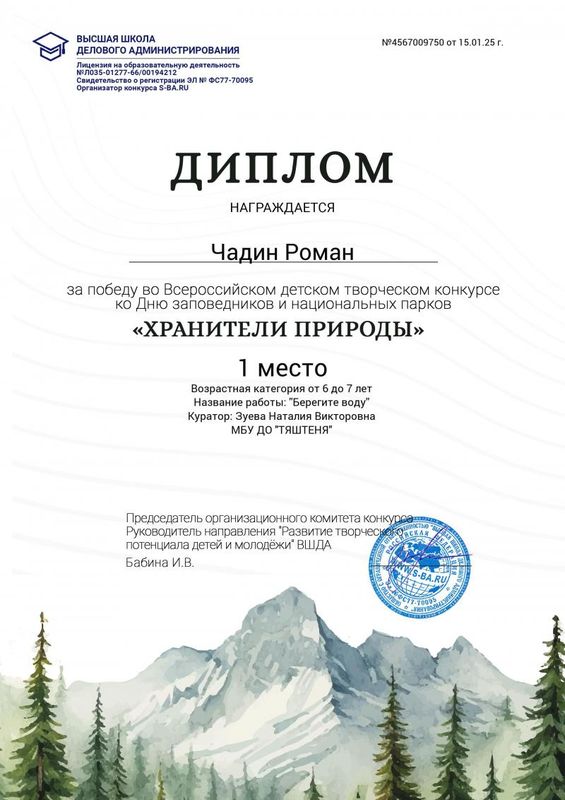 Дипломом за I место Всероссийского детского творческого конкурса ко Дню заповедников и национальных проектов «Хранители природы» награжден Чадин Роман (педагог Зуева Н.В.)