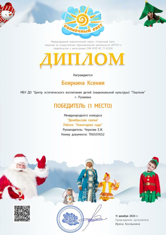 Дипломом за I место Международного конкурса «Декабрьская сказка» награждена Бояркина Ксения (педагог Чернова Е.И.)