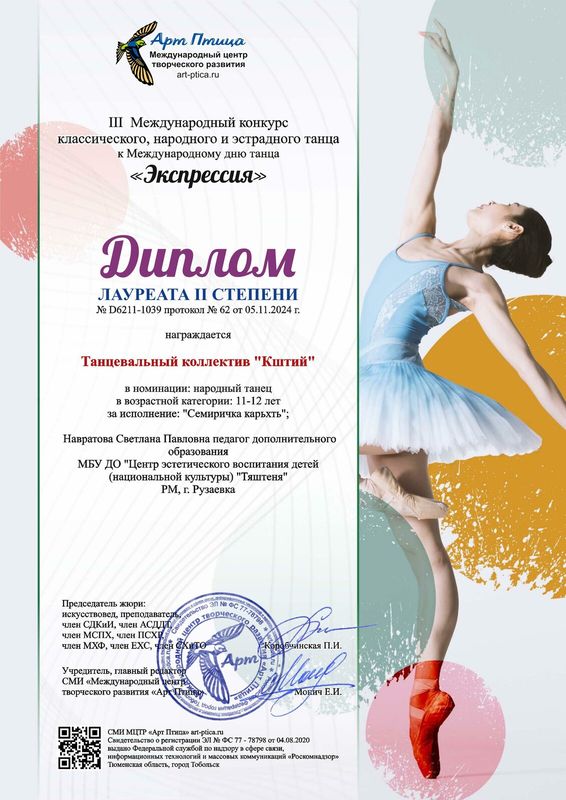 Диплом лауреата II степени III Международного конкурса классического, народного и эстрадного танца к Международному дню танца « Экспрессия» награжден танцевальный коллектив "Кштий" (педагог Навратова С.П.)