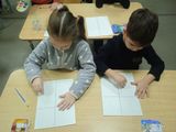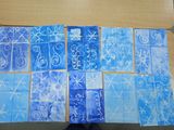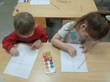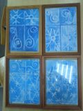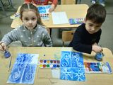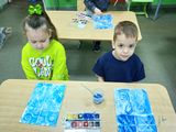 Затем ребята перешли к практической части: они нарисовали узоры с использованием нетрадиционной техники рисования восковыми мелками, с последующим раскрашиванием фона голубой и синей акварелью.