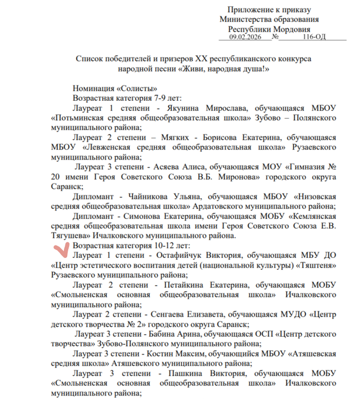 Рузаевский район в возрастной категории 10 – 13 лет представляла воспитанница МБУ ДО "Центр эстетического воспитания детей (национальной культуры) "Тяштеня" Остафийчук Виктория.